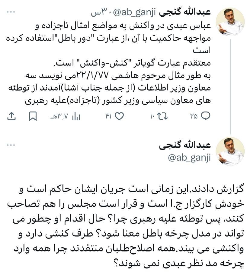 به گزارش 24 آنلاین، عبدالله گنجی در شبکه اجتماعی ایکس نوشت: