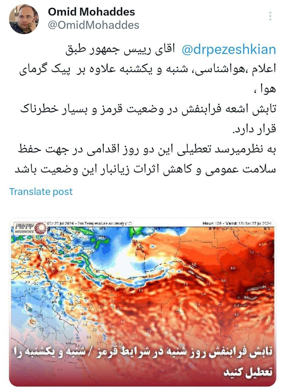 یک فعال اجتماعی از پزشکیان خواست تا شنبه و یکشنبه را به دلیل خطرناک بودن گرمای هوا برای سلامت مردم، تعطیل کند.