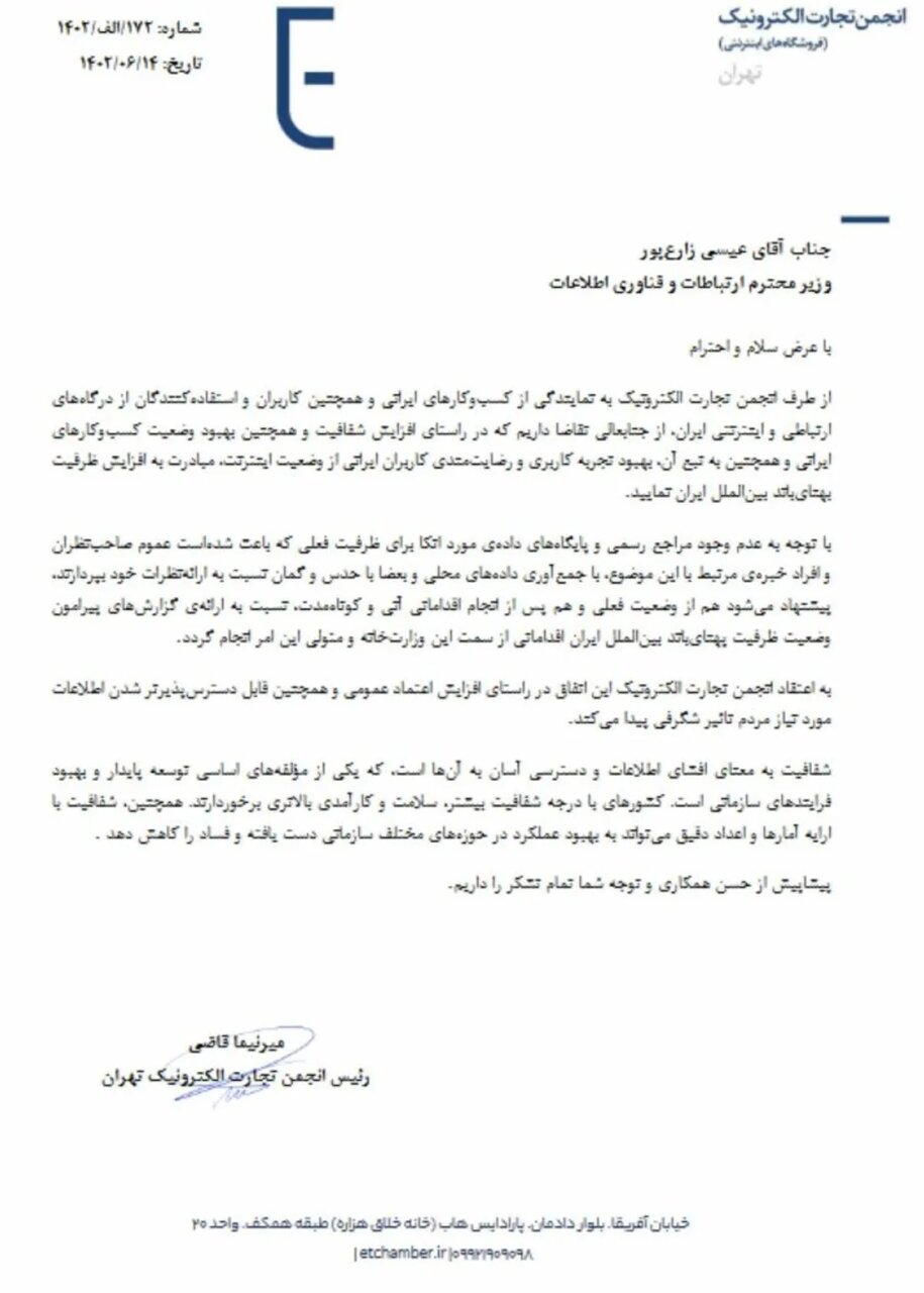 علاوه بر این ۳ مرجع بینالمللی، انجمن تجارت الکترونیک بارها در جلسات حضوری، طی نامهی رسمی ارسالی (به شماره ۱۷۲/الف/۱۴۰۲) و در متن گزارشهای انجمن، از وزارت ارتباطات دعوت کرده است، میانگین سرعت کاربران ایرانی در اتصال به اینترنت (نه شبکهی داخلی) را منتشر کنند تا بتوان به آن گزارش استناد کرد.