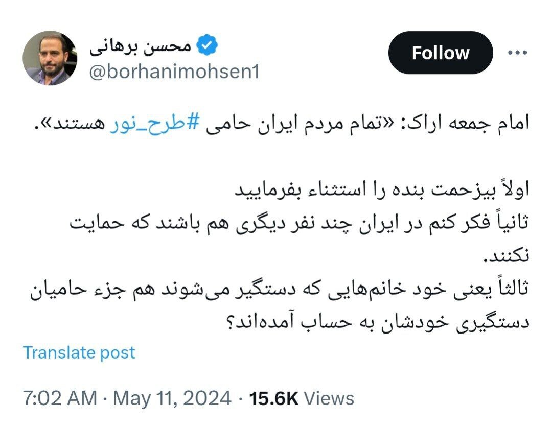 محسن برهانی به سخنان امام جمعه اراک در خصوص حمایت همه مردم از طرح نور واکنش نشان داد.