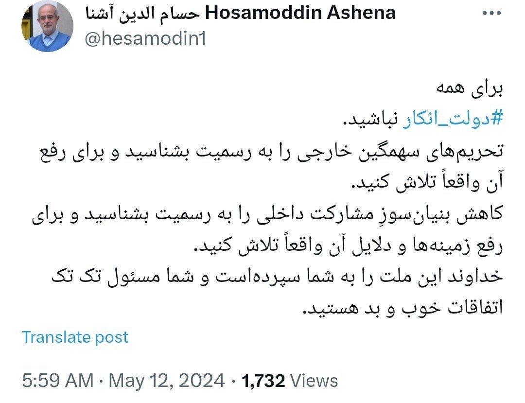 به گزارش 24 آنلاین، حسام الدین آشنا در شبکه اجتماعی ایکس خطاب به دولت سیزدهم نوشت: