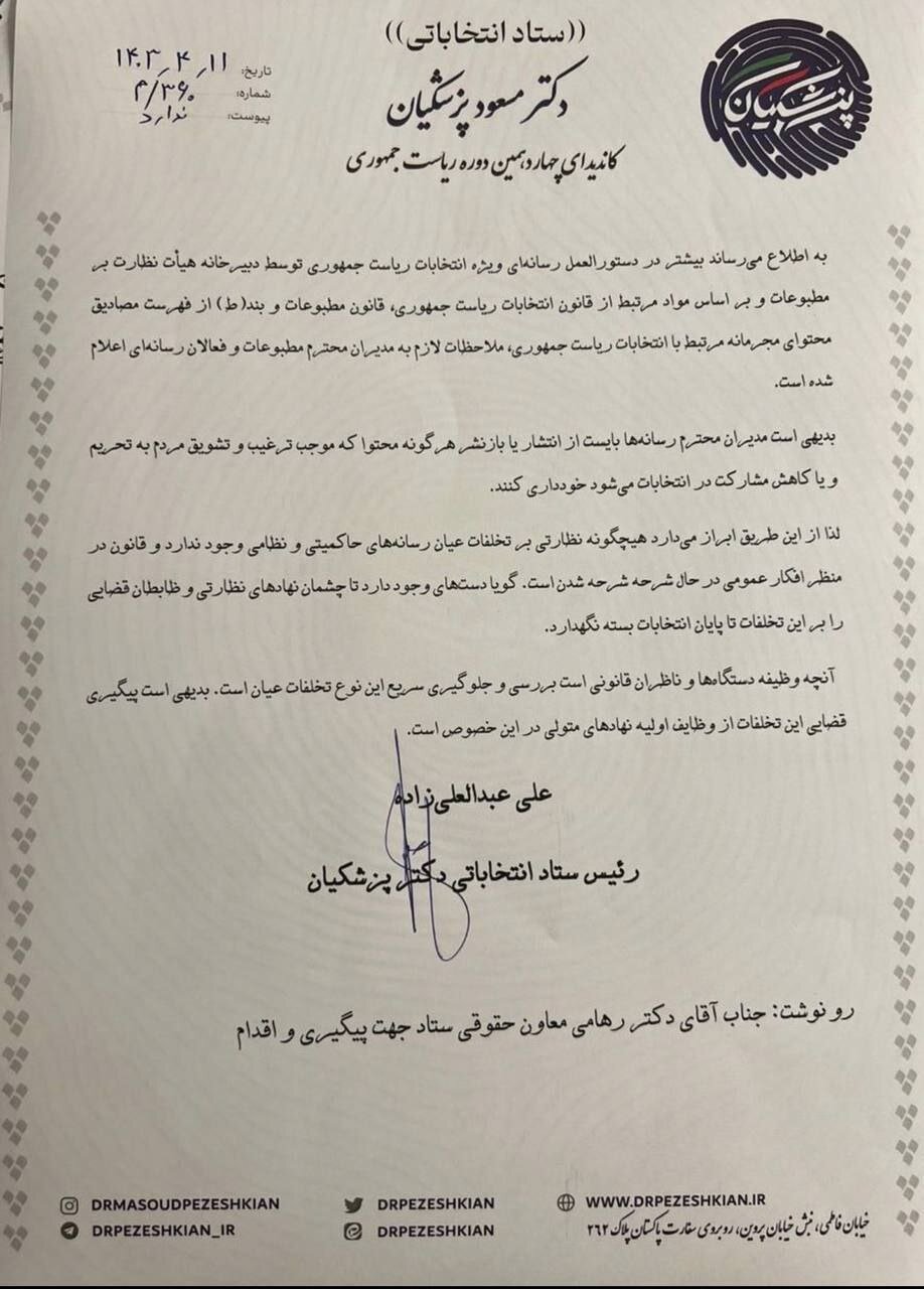 رئیس ستاد انتخاباتی مسعود پزشکیان به تبلغیات برخی از رسانههای دولتی، حاکمیتی و نظامی به نفع سعید جلیلی اعتراض کرد.