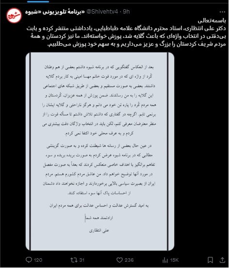 برنامه تلویزیونی «شیوه» به علت اظهارات اخیر کارشناس برنامه اش در خصوص اعتراضات ۱۴۰۱ عذرخواهی کرد.
