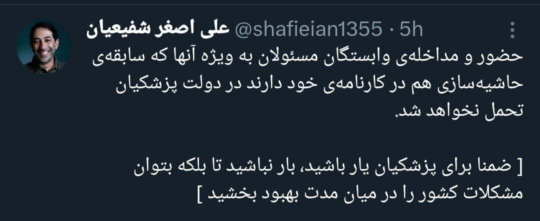 به گزارش 24 آنلاین، علی اصغر شفیعیان، مدیر مسئول انصاف نیوز، در شبکه اجتماعی ایکس نوشت: «حضور و مداخله وابستگان مسئولان به ویژه آنها که سابقهی حاشیه سازی هم در کارنامه خود دارند در دولت پزشکیان تحمل نخواهد شد. [ضمنا برای پزشکیان، یار باشید، بار نباشید تا بلکه بتوان مشکلات کشور را در میان مدت بهبود بخشید]