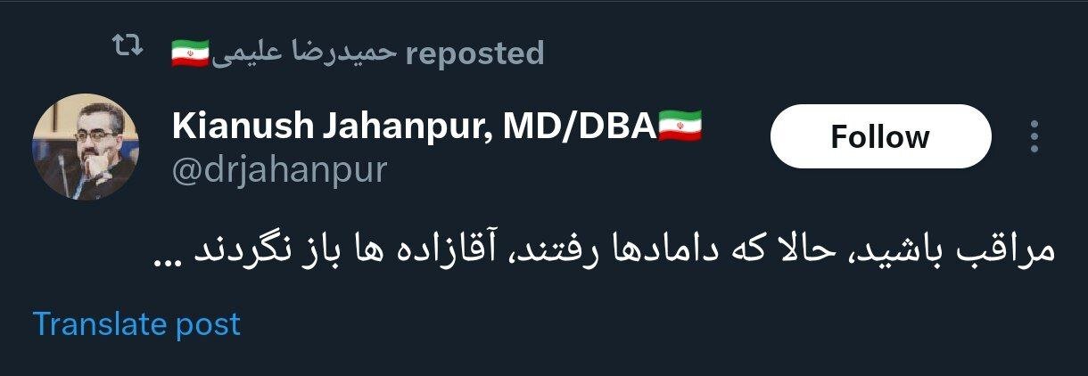 کیانوش جهانپور، سخنگوی اسبق وزارت بهداشت، هم در واکنش به این ماجرا نوشت: «مراقب باشید، حالا که دامادها رفتند، آقازاده ها بازنگردند...»