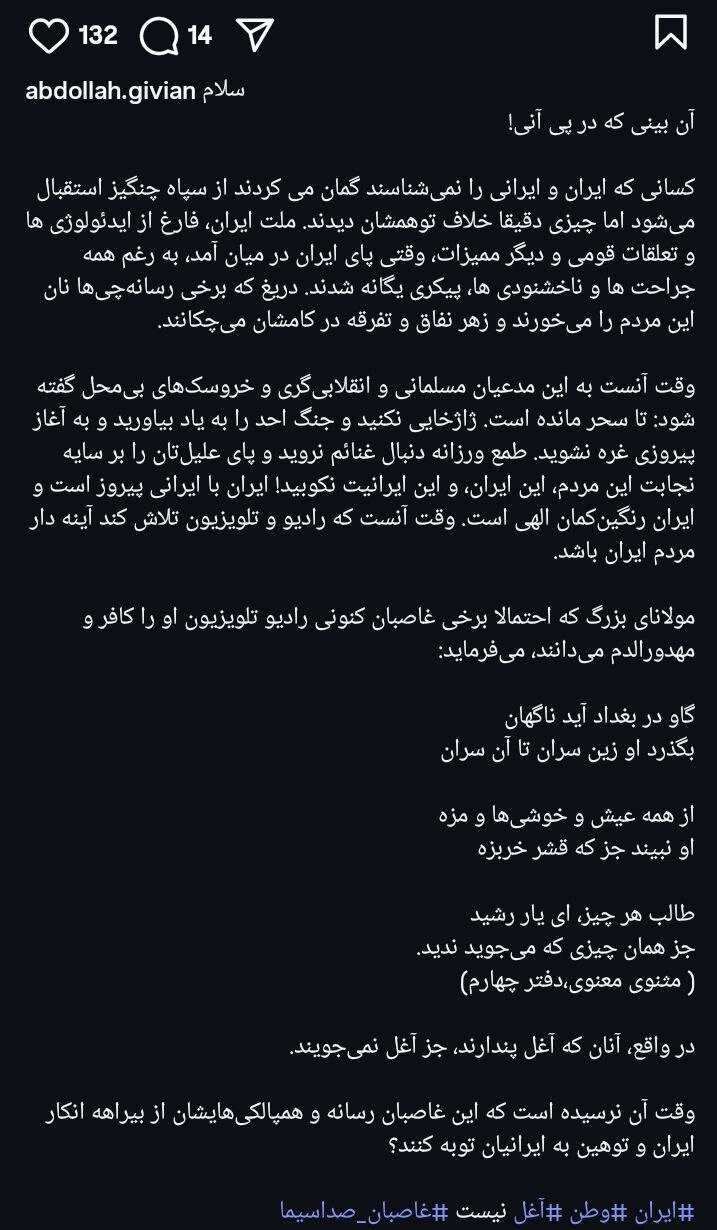 مولانای بزرگ که احتمالا برخی غاصبان کنونی رادیو و تلویزیون او را کافر مهدورالدم میدانند میفرماید: