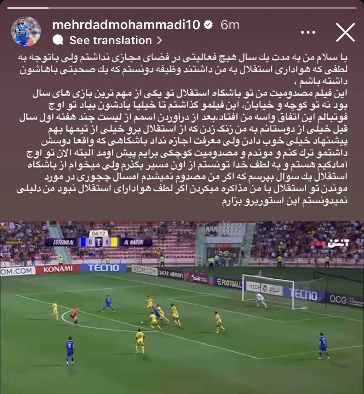 مهرداد محمدی با انتشار یک استوری به اتفاقات اخیر واکنش نشان داد.
